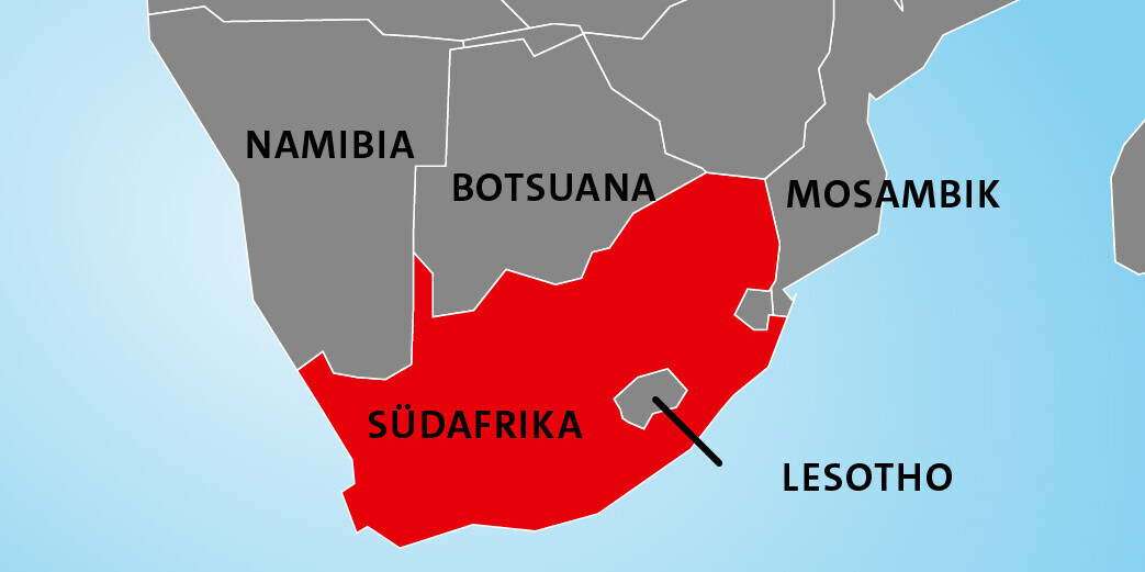 - Karte: Südafrika liegt an der Südspitze des afrikanischen Kontinents zwischen dem Indischen und dem Atlantischen Ozean. Das Land ist etwa dreimal so groß wie Deutschland.
