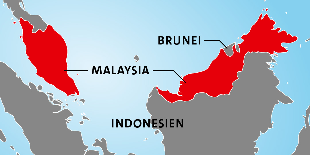 Malaysia liegt geografisch auf zwei Inselteilen: Das Land erstreckt sich über Teile der malaysischen Halbinsel sowie Teile der Insel Borneo. Auf beiden Inseln befinden sich große Regenwälder, in denen Palmöl abgebaut wird.