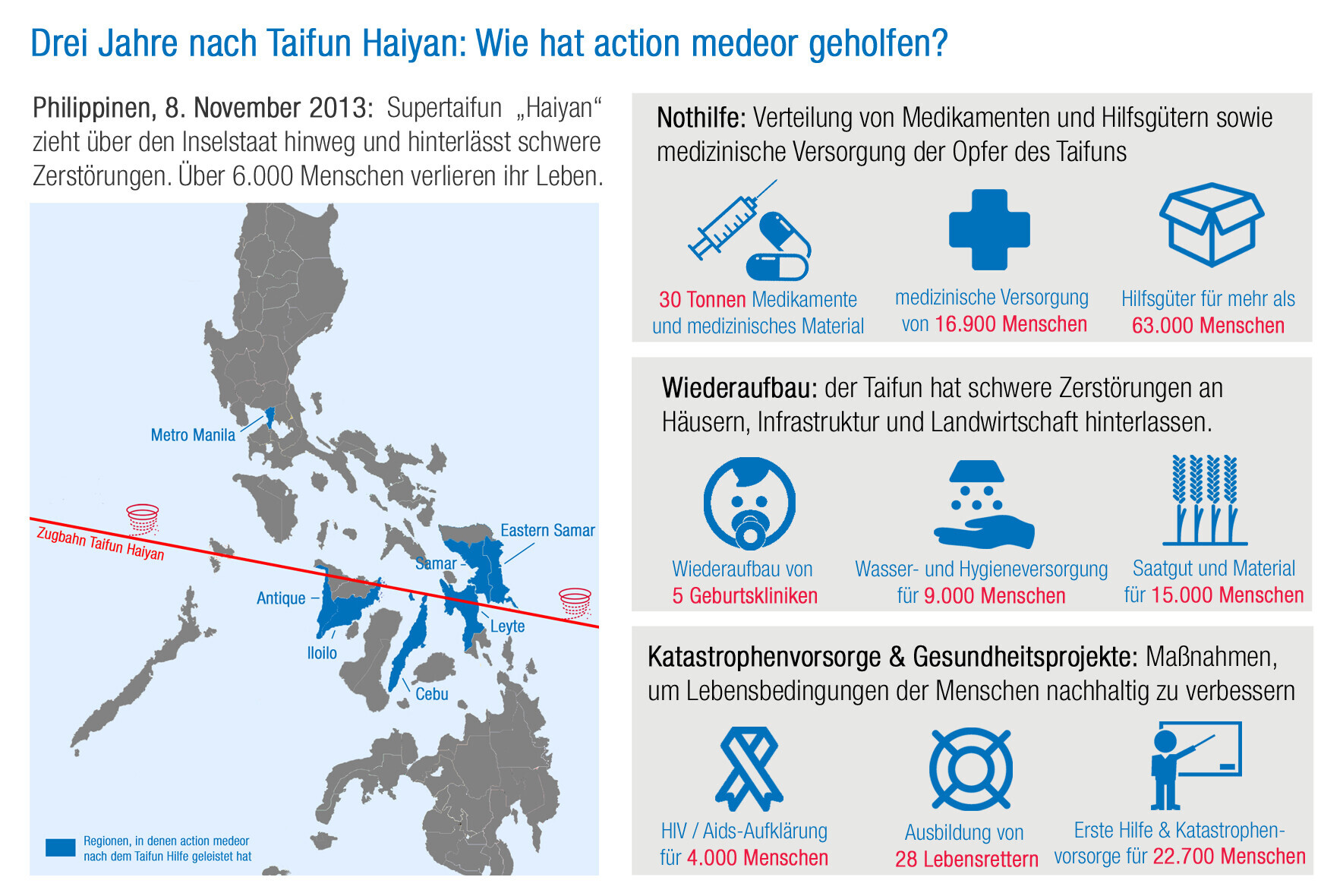 Sofort begannen Mitarbeiter im Medikamentenlager von action medeor in Tönisvorst, Hilfssendungen für die Opfer des Taifuns zu packen. Um den großen Bedarf an Medikamenten und medizinischem Material vor Ort so schnell und flexibel wie möglich decken zu können, baute action medeor ein temporäres Medikamentenlager auf der philippinischen Insel Cebu auf. Insgesamt wurden über 30 Tonnen medizinische Hilfsgüter auf die Philippinen versandt und an Ärzteteams und Gesundheitseinrichtungen verteilt. Gemeinsam mit lokalen Partnerorganisationen organisierte action medeor die medizinische Versorgung von fast 17.000 Menschen in Gesundheitseinrichtungen und durch mobile medizinische Teams.