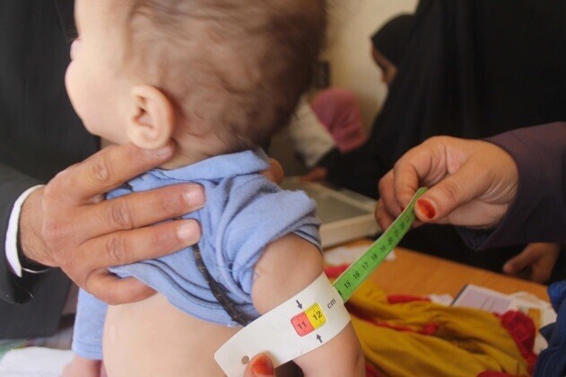 Auf dem Foto misst ein Helfer den Oberarm eines kleinen Kindes, um den Grad der Unterernährung festzustellen.