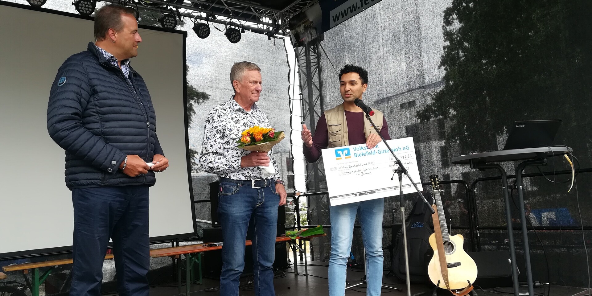 Wir bedanken uns von Herzen für sein Engagement und sind froh, dass ein ehrenamtlicher Helfer unseres Bündnisses (Foto rechts) ihn bei einer symbolischen Spendenscheck-Übergabe getroffen hat.