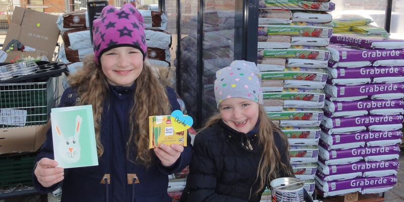 Davor hatten die Mädchen mit Flyern Werbung für ihre Aktion gemacht und fleißig gebastelt: Jede:r Spender:in bekam als Dankeschön blau-gelbe Herzen und Osterkarten überreicht.
