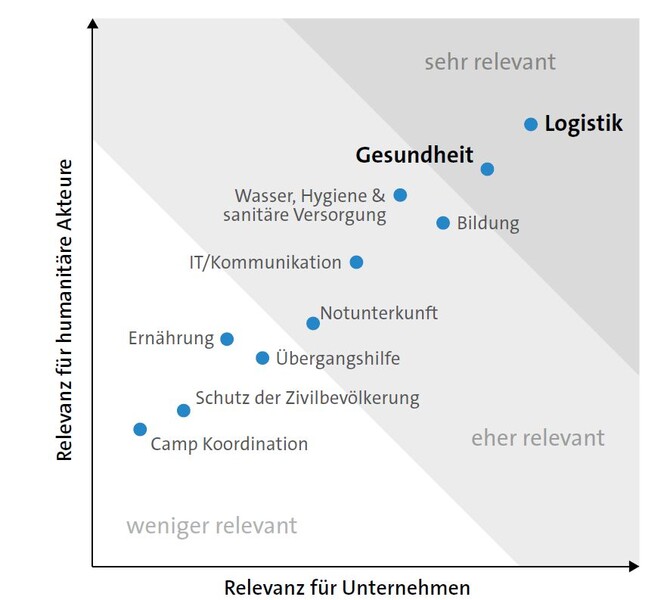 Eine Umfrage unter den Unterstützern der Initiative ergab, dass die Bereiche Gesundheit und Logistik besonders hohe Relevanz für unternehmerisches Engagement in der Humanitären Hilfe haben. Im Rahmen von Netzwerktreffen untersuchen Vertreter des Privatsektors, von Nichtregierungsorganisationen, aus der Wissenschaft sowie Verantwortliche des Auswärtigen Amtes diese Themen gemeinsam.