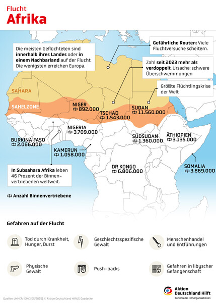 Aktion Deutschland Hilft, Bündnis von mehr als 20 Hilfsorganisationen, leistet geflüchteten Menschen in und aus Afrika humanitäre Hilfe.