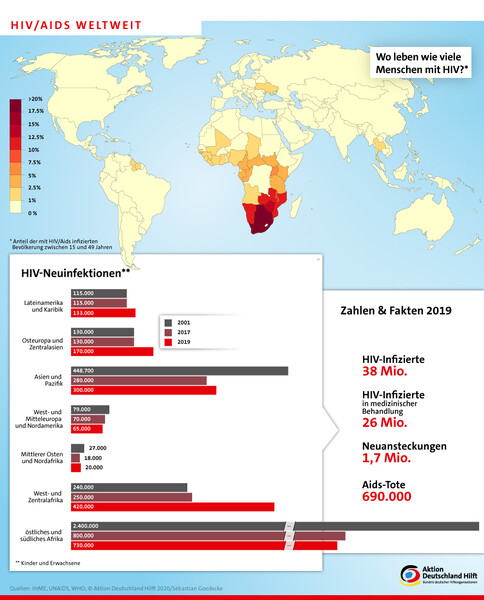 In unserem Bündnis ist der Kampf gegen Aids ein wichtiger Teil von Hilfsprojekten. Denn nur so lässt sich langfristig etwas verändern. Und nur so lassen sich die Folgen und die Verbreitung der Immunschwächekrankheit eindämmen und Neuinfektionen verhindern. Erfahren Sie hier, wie Organisationen unseres Bündnisses weltweit helfen!