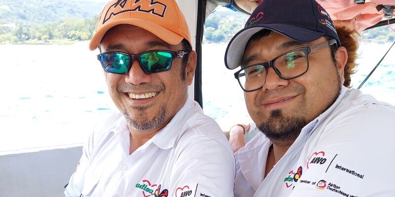 Stolz können die Helfer Mauricio und Antonio die Logos ihrer Organisationen acopedia und ASIDA auf den Hemden während der Überfahrt von Panajachel zu den bedürftigen Familien nach Cerro de Oro präsentieren. Sie sind lokale Partner von AWO International für inklusive Katastrophenvorsorge in Guatemala. Und sie haben jetzt schon viel erreicht.