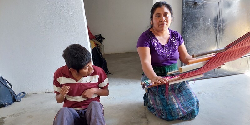 Tochter Santa Maria verdient ein karges Einkommen durch den Verkauf von Stoff mit traditionellem Muster. Die bunten Vögel und Blumen webt sie nach alter Technik draußen unter einem Baum, auf den Knien sitzend und den Webrahmen auf der Hüfte. Eineinhalb Monate braucht sie, bis genug Stoff für eine Bluse fertig ist.