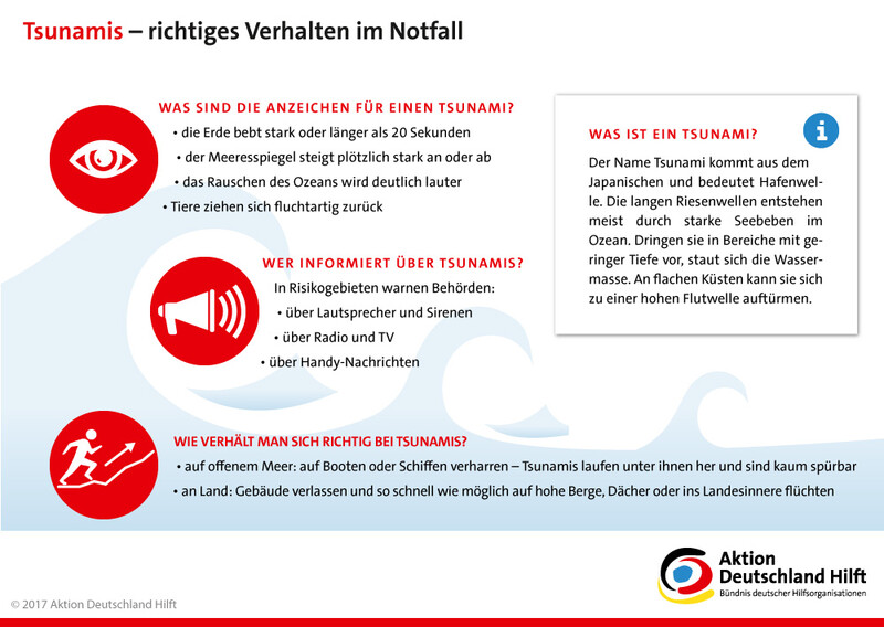 Wenn man von einem Tsunami eingeholt wird, sollte man versuchen, sich an etwas festzuklammern, um sich über Wasser zu halten. Dies können Trümmer wie Türen und Äste oder auch Baumstämme sein. Sobald das Wasser zu sinken beginnt, besteht die Gefahr, durch den Sog ins Meer gezogen zu werden.