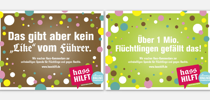 Mit humorvollen und intelligenten Kommentaren auf die fremdenfeindlichen Beiträge zeigt die Spendenaktion "Hass Hilft" auf, wie man mit dem täglichen Hass im Internet umgehen kann. Mit bereitgestellten "Hass Hilft"-Posts antworten Partner der Initiative auf die hasserfüllten Beiträge, wodurch diese gezählt und unfreiwillig in eine Ein-Euro-Spende umgewandelt werden. Die Spendenmittel stellen Unternehmen und Privatpersonen zur Verfügung.
