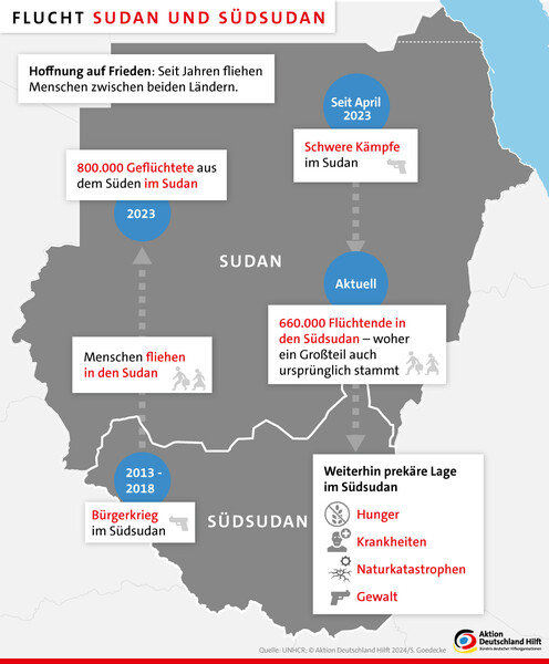 Henning Kronenberger: Im Sudan, im Südsudan und in den Nachbarländern gibt es sehr viel Fluchtbewegung. Im Sudan sind zurzeit geschätzt 9 Millionen Menschen auf der Flucht, 2 Millionen davon sind ins Ausland geflohen, in den Tschad, nach Ägypten und zum Teil auch in den Südsudan. 25 Millionen Menschen sind nach Schätzungen der UN auf humanitäre Hilfe angewiesen. Unter den Menschen, die in den Südsudan fliehen, sind auch Rückkehrer, die vor dem eigenen Bürgerkrieg zwischen 2013 und 2018 Zuflucht im Sudan gesucht haben. Schätzungsweise 600.000 Menschen waren das, von denen jetzt mehr als 500.000 zurückkommen mussten.