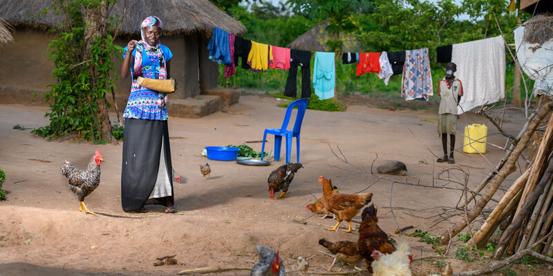 Heute lebt Edna Tumalu mit ihren Kindern im Distrikt Madi Okollo im nördlichen Uganda. Nach einem Training in Ackerbau und Hühnerhaltung, das ihr ein lokaler Partner der Johanniter ermöglichte, machte sie sich als Landwirtin selbstständig.