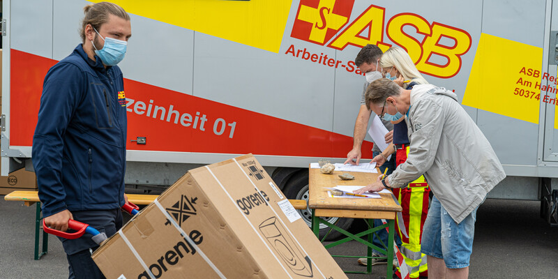Seit Mitte August haben Helferinnen und Helfer vom ASB in Erftstadt über 150 Kühl- und Gefrierschränke sowie 100 Waschmaschinen und 350 Bautrockner an betroffene Haushalte verteilt.