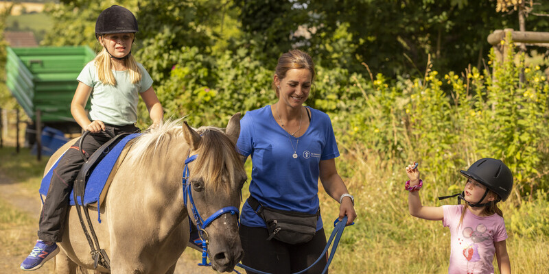 In Mechernich sitzt ein Kind verkehrt herum auf einem Pferd und lacht lauthals. Auch die anderen Kinder auf dem Hof mitten im Grünen wirken gelöst, fröhlich und ganz vertieft in das, was sie gerade tun: striegeln, füttern oder mit Ponys spazieren gehen.
