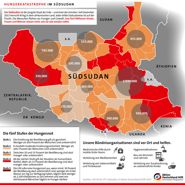 Zahlen können die Not nicht annähernd wiedergeben: Jeder dritte Südsudanese ist auf der Flucht, das sind eine Million Menschen mehr als im vergangenen Jahr. Sie fliehen vor Gewalt, ebenso wie vor anhaltendem Hunger. Fast fünf Millionen Menschen und damit fast jeder Zweite weiß nicht, wie er satt werden soll. In vielen Bundesstaaten gilt die zweithöchste Hungerkategorie.