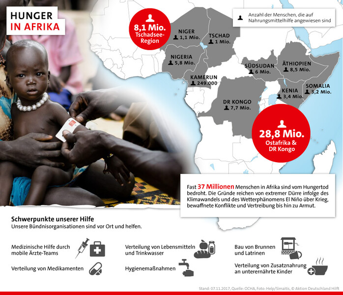 bittet um Spenden für von Hunger betroffene Menschen in Afrika:
