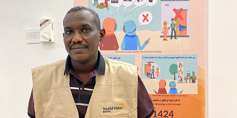 Nagmeldin arbeitet für unsere Bündnisorganisation World Vision im Sudan. Er bietet Schulungen zu friedensfördernden Maßnahmen und zum Schutz von Kindern vor Gewalt an. Dabei spricht er mit Frauen und Männern, darunter Führungspersönlichkeiten in Gemeinden, auch über verbreitete Formen geschlechtsspezifischer Gewalt.