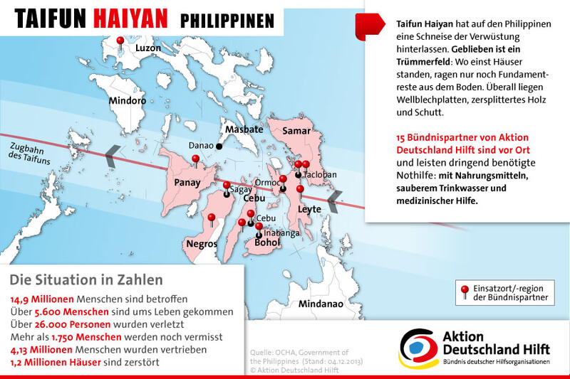 Taifun Haiyan ist der stärkste Sturm, der je über die Inselwelt der Philippinen hinweggefegt ist. Laut den philippinischen Behörden sind über 13 Millionen Menschen in neun Regionen betroffen. Taifun Haiyan hat auf den Philippinen eine Schneise der Verwüstung hinterlassen. Geblieben ist ein Trümmerfeld. Wo einst Häuser standen, ragen nur noch Fundamentreste aus dem Boden. Überall liegen Wellblechplatten, zersplittertes Holz und Schutt.