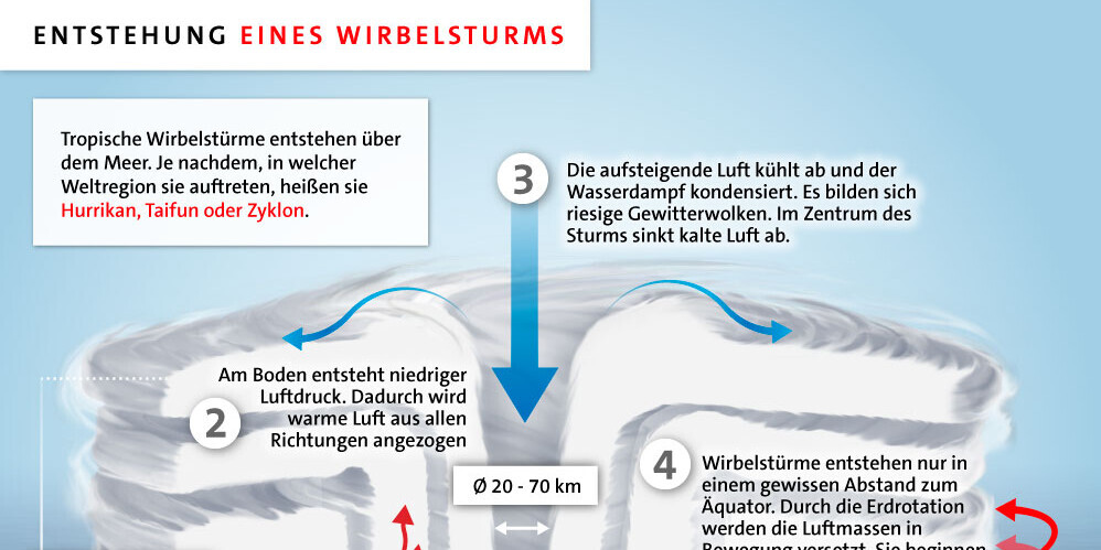 Je näher die Welle dem Festland kommt, desto kürzer wird der Abstand zwischen den Wellenkämmen. Dadurch werden die Wellenberge immer höher. Liegt die Wellenhöhe auf dem offenen Meer meist noch bei weniger als einem Meter, kann sie sich an Land meterhoch auftürmen. Die Wassermassen dringen so oft viele Kilometer ins Landesinnere vor und zerstören ganze Landstriche.