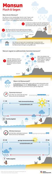 Der Monsun ist ein beständiger Wind in den Tropen und Subtropen. Die Monsunwinde ändern halbjährlich ihre Richtung. Vor allem in Süd- und Südostasien bestimmen sie das Wetter. Monsune bringen nach monatelanger Trockenheit den lang ersehnten Regen. Doch oft sorgen die Wassermassen für Überschwemmungen und großes Leid.