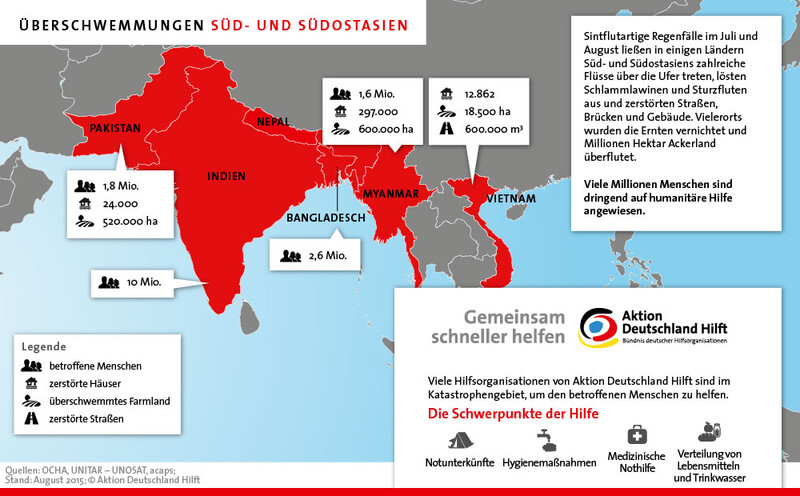 Sintflutartige Regenfälle im Juli und August ließen in einigen Ländern Süd- und Südostasiens zahlreiche Flüsse über die Ufer treten, lösten Schlammlawinen und Sturzfluten aus und zerstörten Straßen, Brücken und Gebäude. Vielerorts wurden die Ernten vernichtet und Millionen Hektar Ackerland überflutet. Viele Millionen Menschen sind dringend auf humanitäre Hilfe angewiesen.