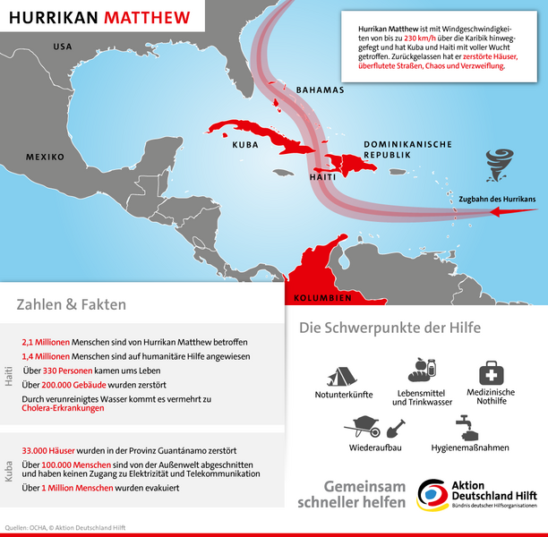 Aktion Deutschland Hilft startete am 5. Oktober 2016 einen Spendenaufruf für die vom Hurrikan Matthew betroffene Bevölkerung in Haiti. Dabei kamen mehr als 5,6 Millionen Euro Spenden zusammen.